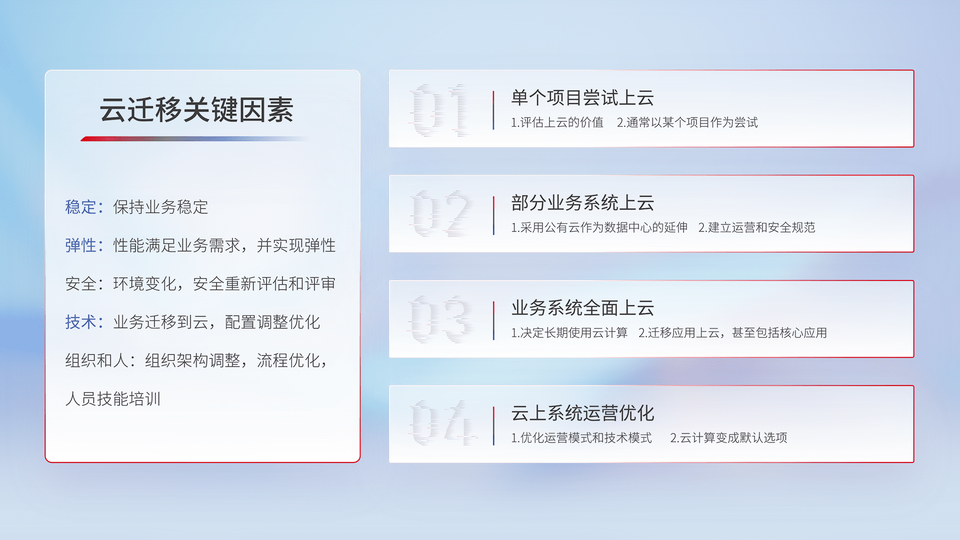 结合实际业务,,从规划设计、、、云平台选型、、、、云原生改造、、数据迁移、、、、集成交付,,迁移全过程为客户识别最佳上云路径,,,,做好风险识别管理,,,,设计网络架构、、、身份权限、、、安全审计合规、、、、操作审计、、日志审计、、、监控告警策略、、、、多站点容灾设计等,,,对云上基础设施进行整体规划,,,提升IT治理水平,,,以满足弹性、、、、高可用、、、高性能的需求。。
